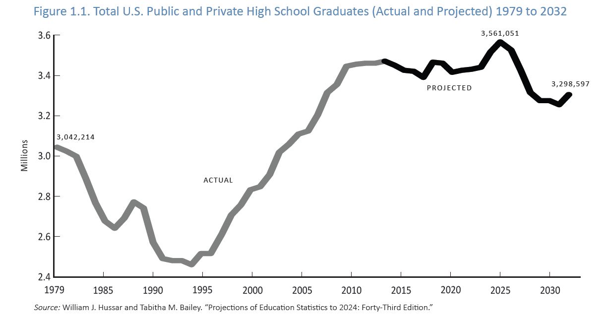 The plateauing and eventual projected decline of high school graduates brings to an end 15 years of consistent increases. The population of high school graduates jumped from 2.52 million in 1996 to 3.47 million in 2013, which is the last year confirmed graduation tallies are available.