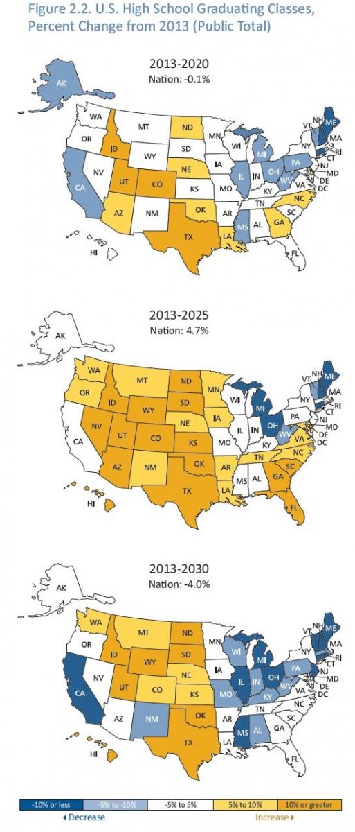 Tuesday’s report projects Hispanic graduates spiking by 50 percent at public high schools from 2014 to the mid-2020s. That would mean about 920,000 graduates per year around 2025. Asian/Pacific Islander graduates from public high schools are projected to spike by 30 percent over the same time frame. The total number of black public high school graduates is expected to level off and decline slightly after peaking at about 480,000 from 2010 through 2012. Projections have the number of black high school graduates slipping by about 6 percent between now and the early 2030s.