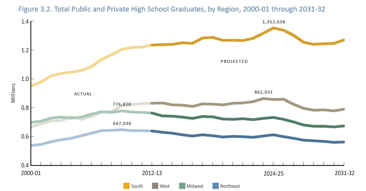 Changes in graduating class sizes are expected to vary significantly by region and state. The Northeast and the Midwest are projected to experience declining numbers of graduates. The West will be home to slight increases. The South will see steady, significant increases.