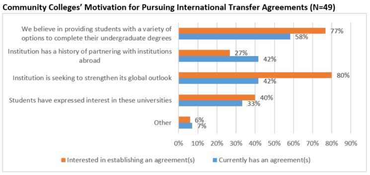 As reflected above, the primary motivation of community colleges for establishing international transfer pathways is to strengthen their global outlook as well as provide their students with more options for completing an undergraduate degree.