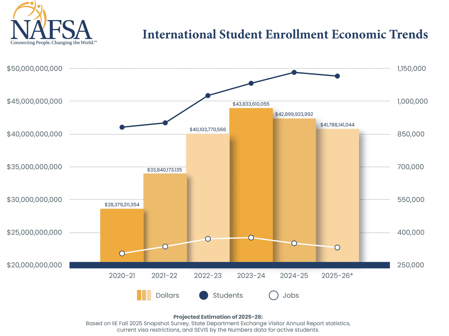 Mark Kopenski: Recovery is possible if policies become more reasonable again, but students now have real choices worldwide and are voting with their feet. The US is no longer the automatic first choice. Institutions need to not only promote their own college but also promote the USA as a desirable destination. The positive side is that international students already contribute tens of billions annually to the US economy through tuition, living expenses, and job creation so there are decades of good-will and alumni globally. This chart from NAFSA highlights the scale of that impact. Institutions that treat international enrollment as a strategic priority, invest in genuine relationships, and work with experienced partners like GSRA will be best positioned to rebuild strong, sustainable pipelines.